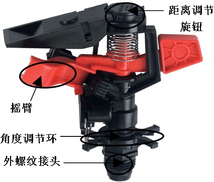 1.摇臂、转轴,保证喷头运转平稳,震动小,更耐化肥和农药腐蚀。